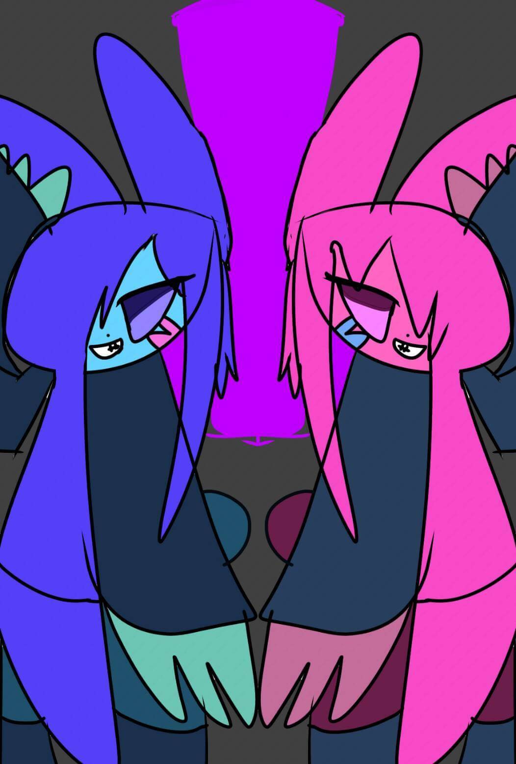 左右対称に描いています。少しずつ色など変えて描いています。動物が大好きで擬人化にしてキャラクターをつくり、絵を描くのか大好きです