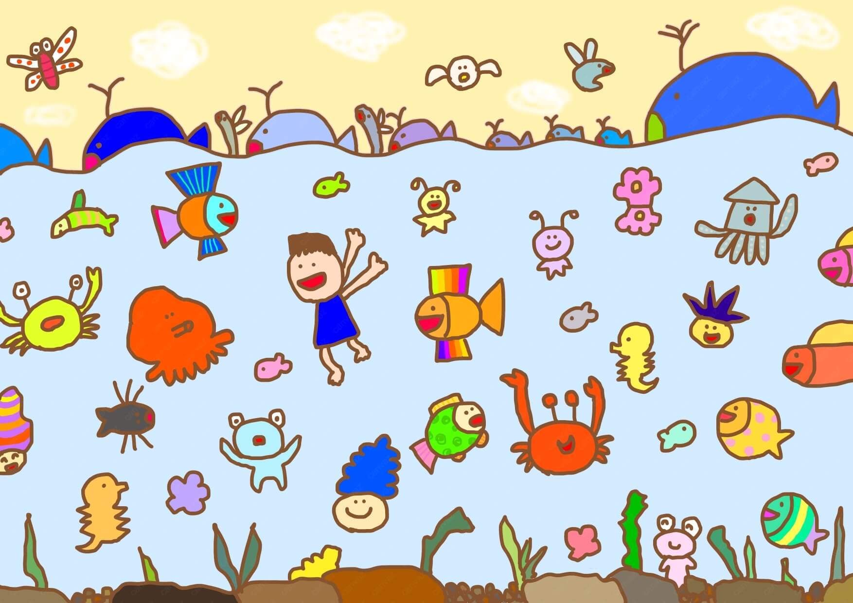 幼い頃に描いた私の絵を叔母が額に入れて飾ってくれていました。遠く離れた中々の会えない叔母ですが、大切にしてくれていることが嬉しくて、改めて今回描かせてもらいました。絵の中は自由。そんな楽しさや自由を感じてもらえると嬉しいです。