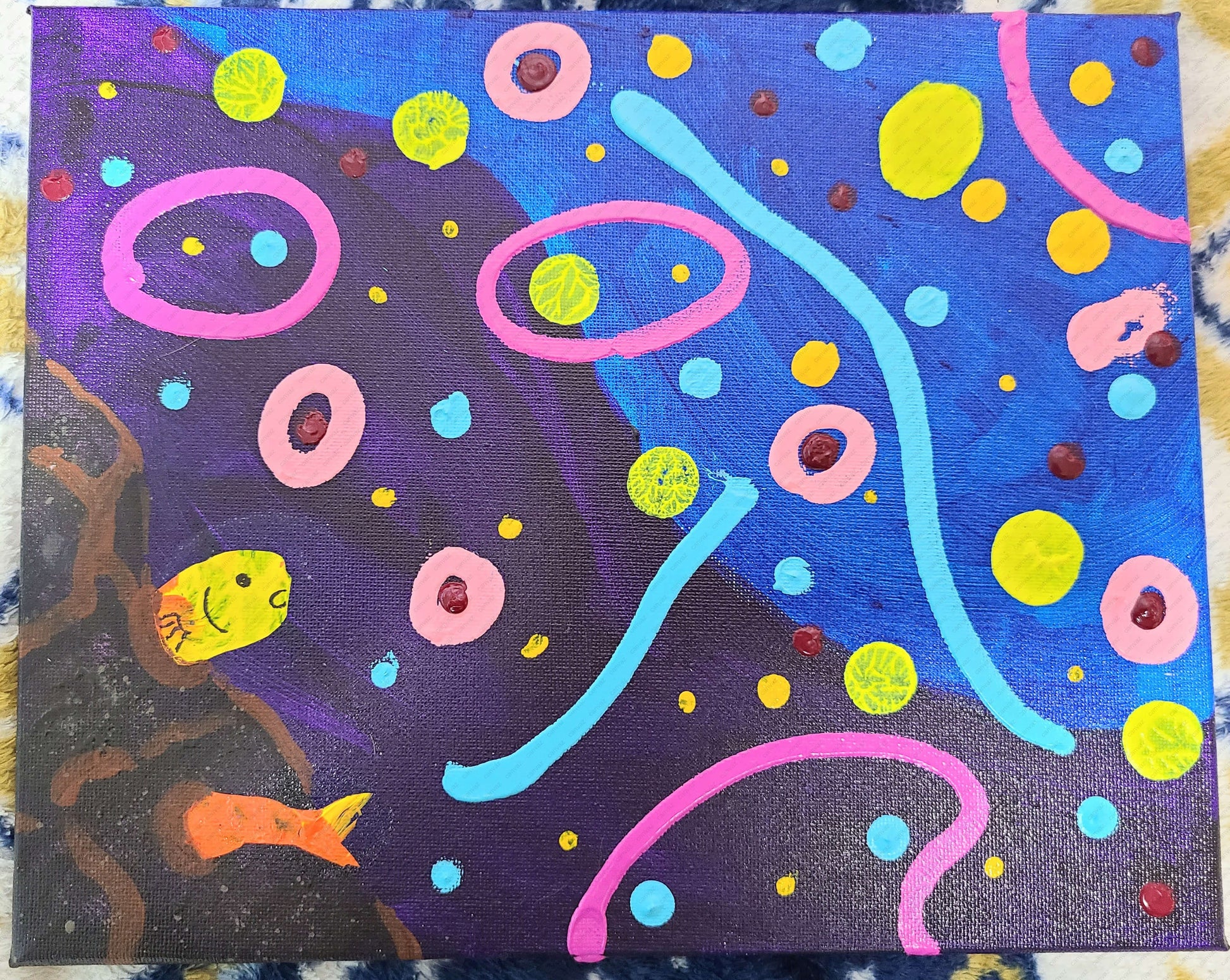 絵の具のチューブから直接出して微生物を表現しました。岩陰の魚はパレットに固まった絵の具を切り貼りして作りました。