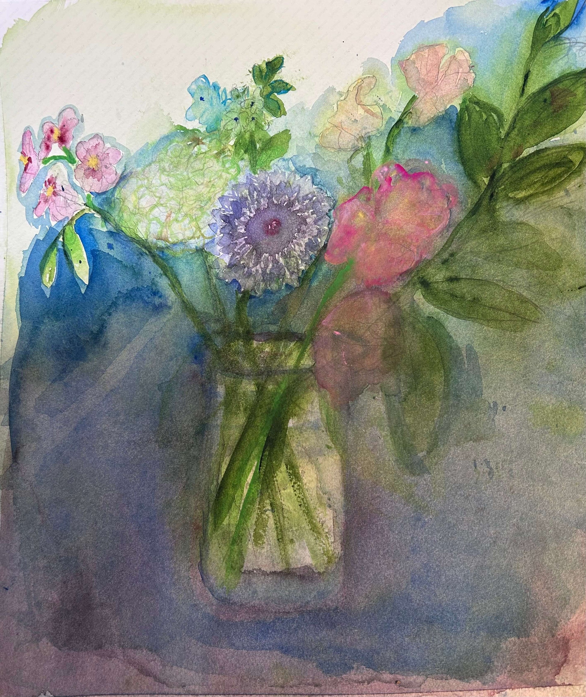 透明水彩を、YouTubeで、勉強中で、基礎の静物画の、動画を見て、うちに、来られた方のプレゼントしていただいた花を描きました。出来ればそろそろ命日の、亡くなった前夫に、渡したい気持ちで描きました