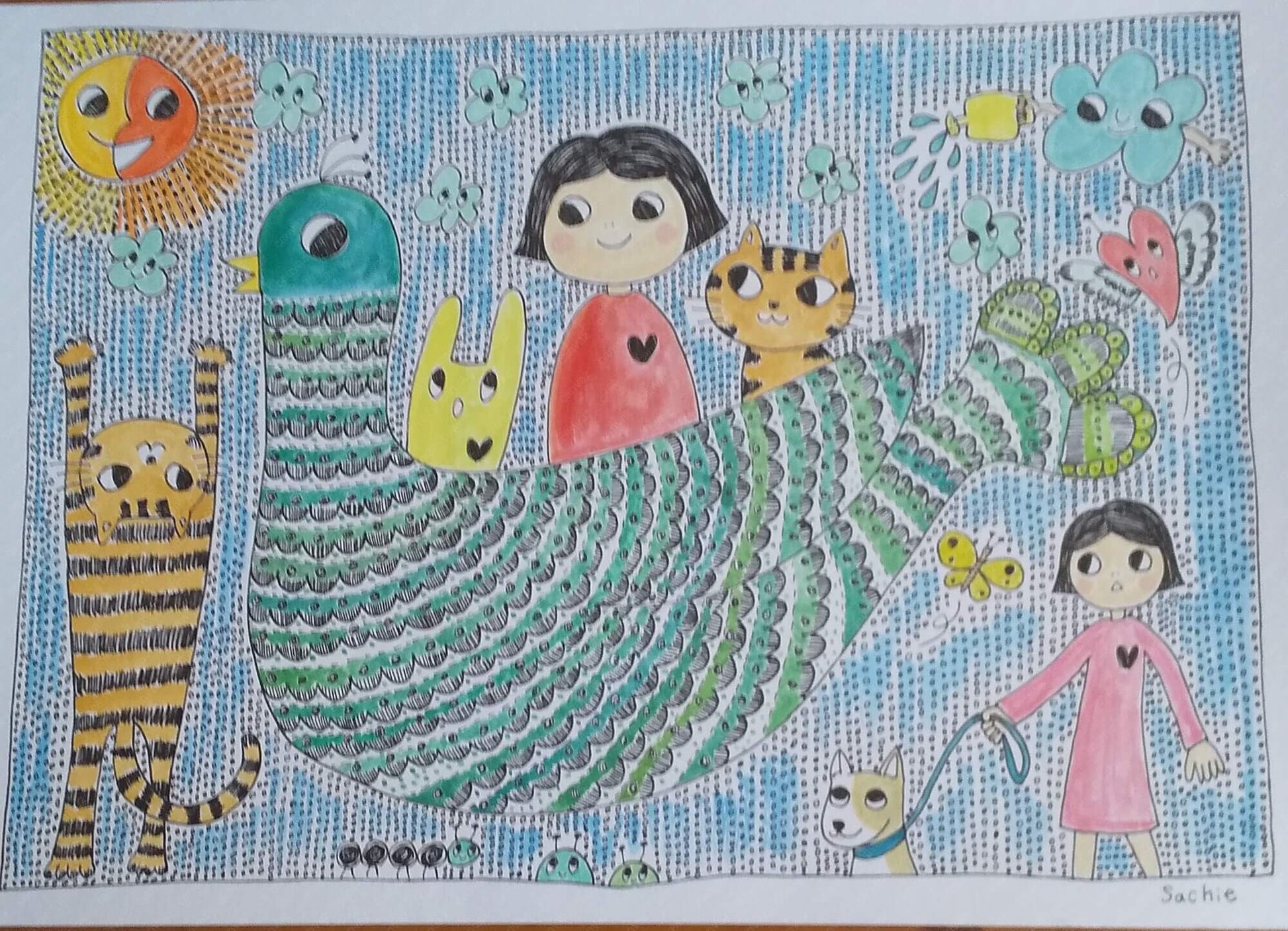 今まで絵に色を塗らず、ペンだけで描いていました。母に色をつけてみたら?と言われ、苦手ではありますが水彩絵具を使ってみました。