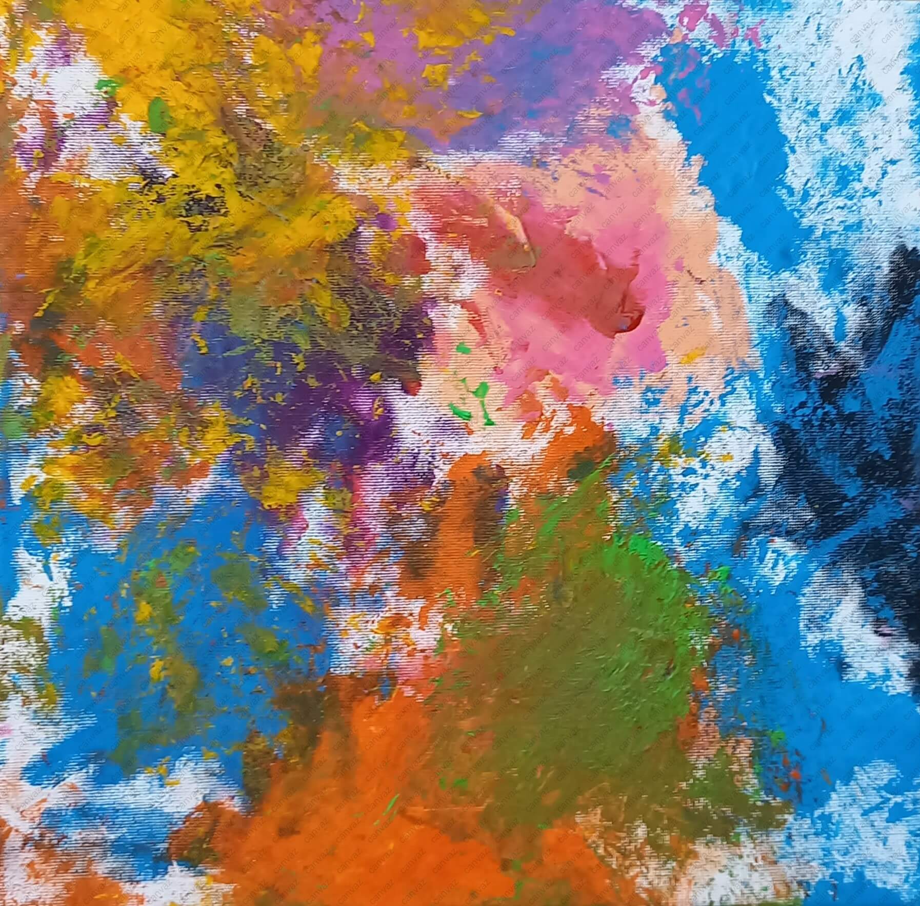 絵を描く事が大好きで毎日描いています。筆を持てないので、自分の指、掌、腕に絵の具を付けて感じるままに描いています。