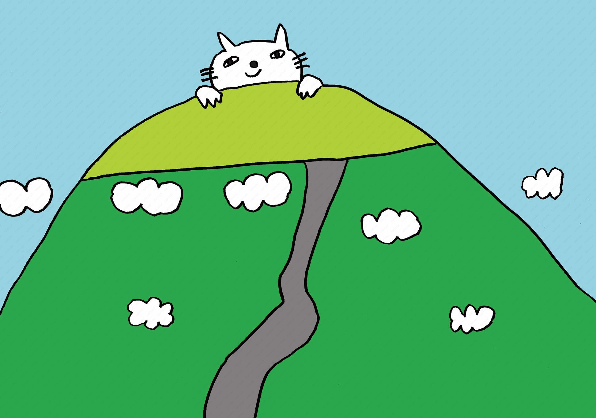 夏の富士山を描きました山は高ので曇は下の方で道のルート描いて山や道の安全を見守ネコを描きました