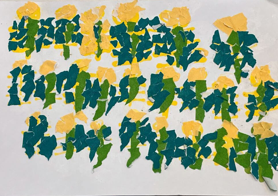 作業の休憩中に菜の花の絵を描き、その上から千切った折り紙を貼っていきました。