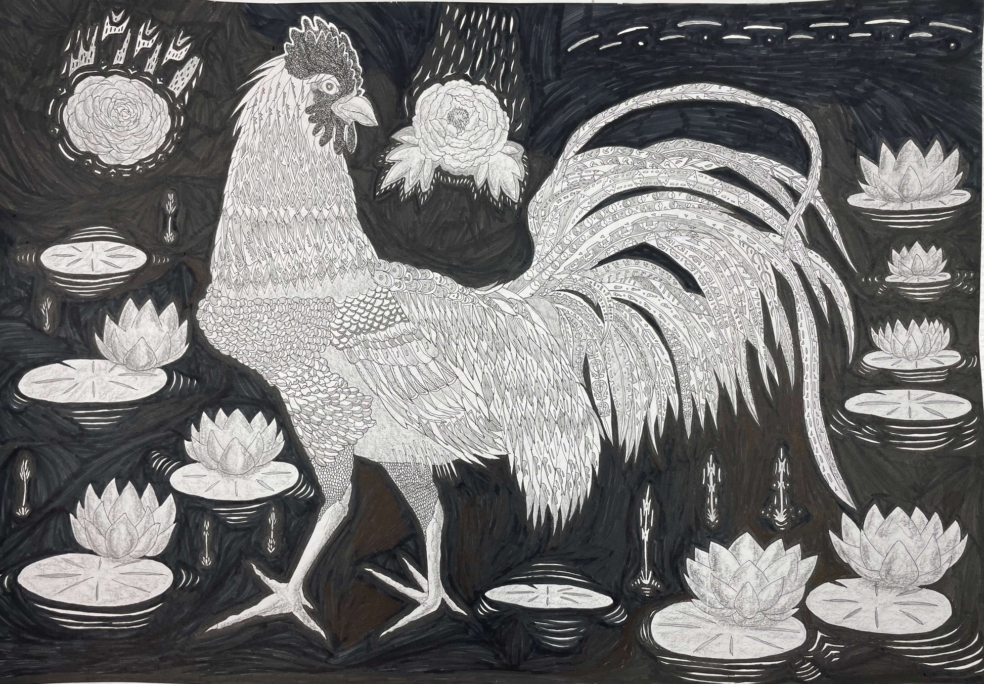 展示用絵画:水面にたたずむニワトリ [作者:ハル]