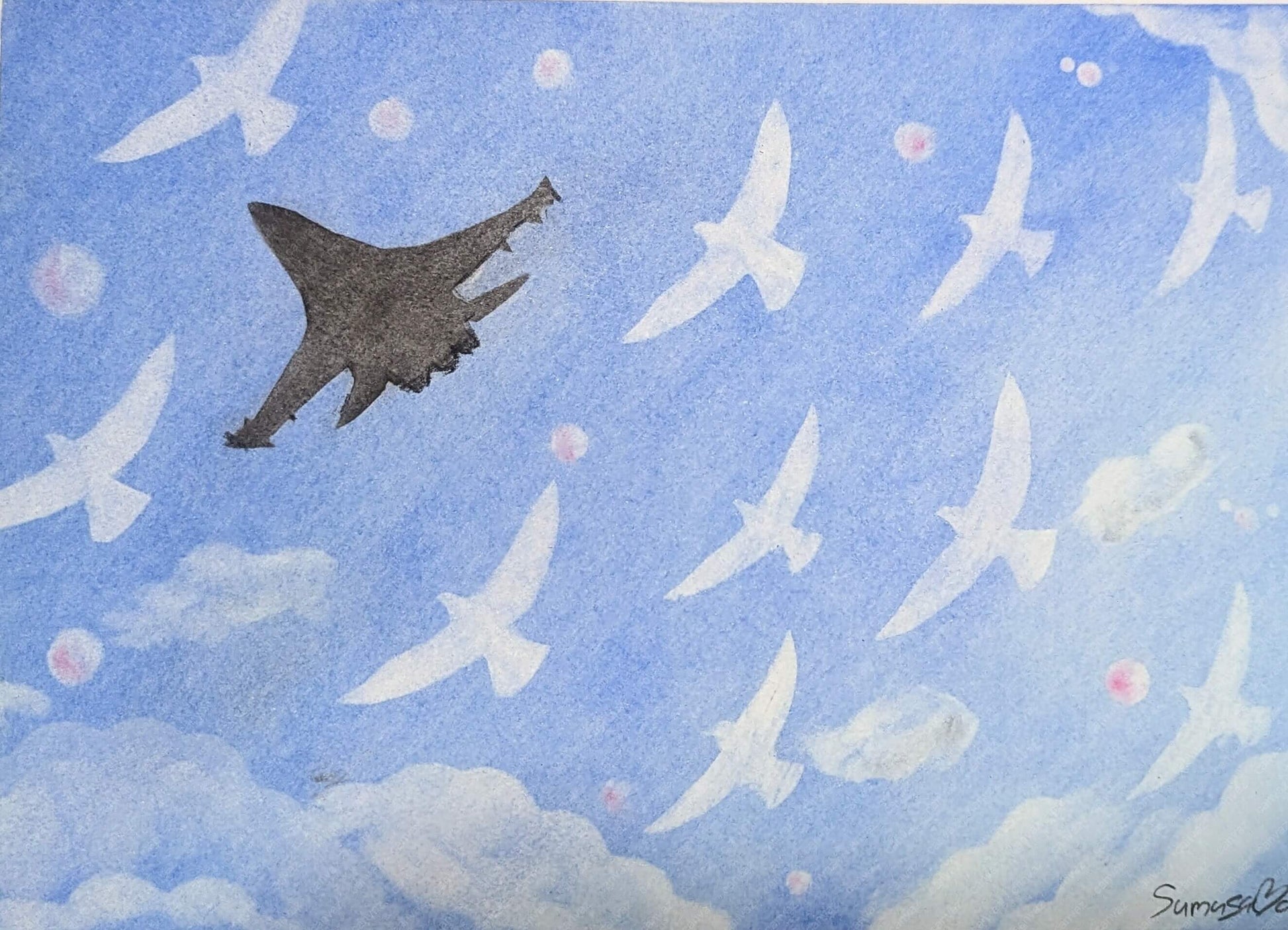 日本では平和の象徴であるハトが戦地にに向かって編隊する戦闘機にとってかわり飛んでいることにより、平和への願いの方がまさることを表現しました。また、最後の1機の戦闘機も取り囲んでいるように、人々の願いが集まれば、戦争は排除できることを伝えたいですが
