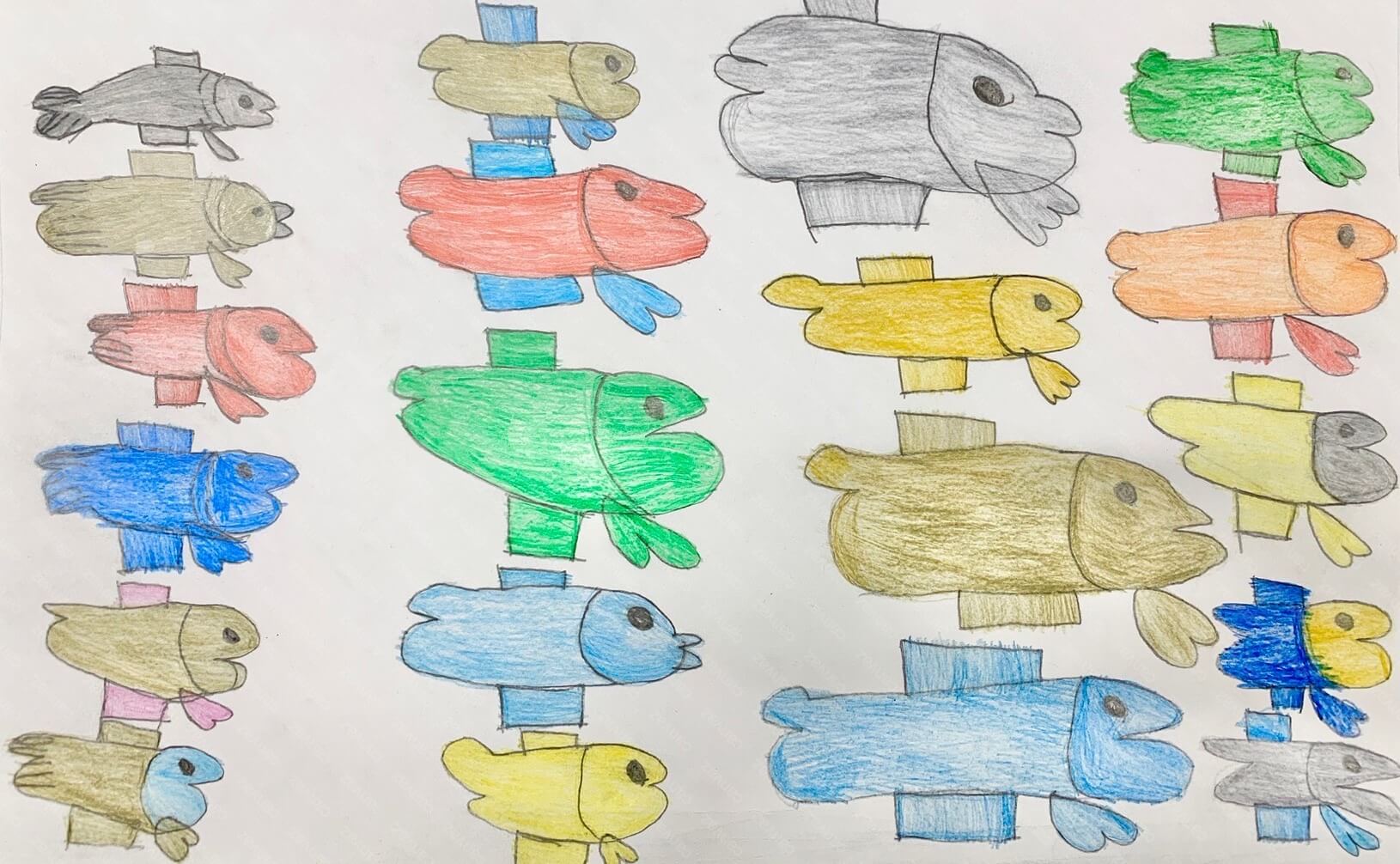 海の中を移動する魚たちを様々な色を使って描きました。一見似ている魚たちですが、よく見ると表情に違いがあるのが特徴です。