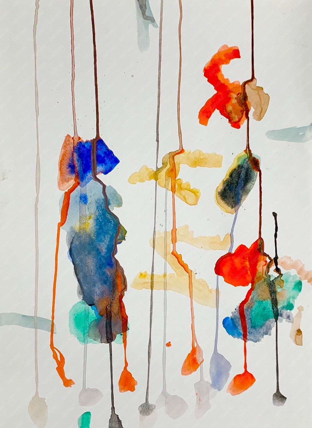 水彩絵の具を何色か使用し、画用紙に思いのままに筆を運んでいます。さらに、ストローで吹いてオリジナリティあふれる作品に仕上げました。